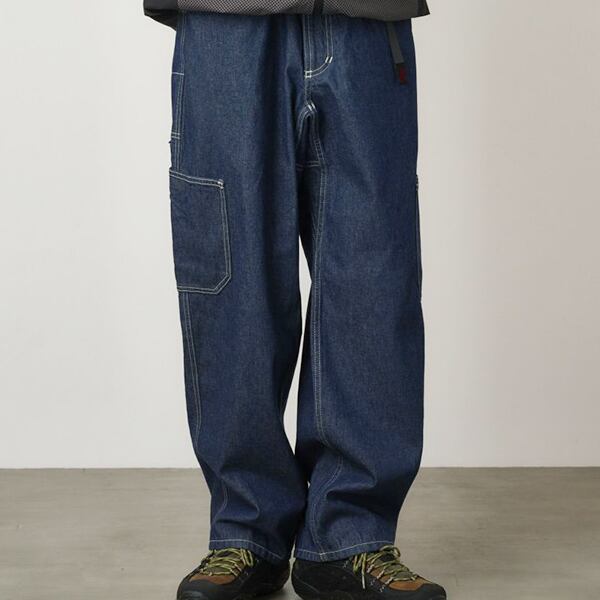 しっかりした質感でハリコシのある、環境配慮エココットンを使用した11オンスデニムを使用した、膝上両脇とお尻にパッチポケットを持つ、ゆとりあるシルエットの GRAMICCI では定番のROCK SLIDE PANT。