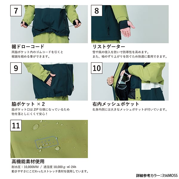 やわらかいストレッチ素材を使用しているため動きやすく、パウダーガードやパスケースなどが付いた充実の機能性で快適なライディングをサポートします。