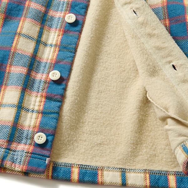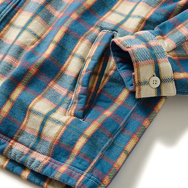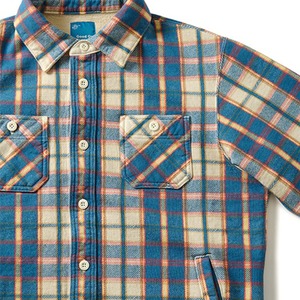 定番の裏起毛スウェット生地(9oz Nap Fleece)にフランネルチェック柄の顔料インクジェットプリントを施してから、裁断・縫製し、落ち着いた色味のオーバーダイ(製品染め)によって柄を馴染ませて、くすんだ風合いのある柔らかい表情に仕上たシャツジャケット。