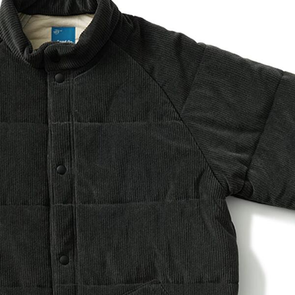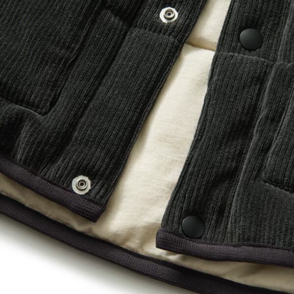 表地には風合い感のある顔料染め(Pigment dye)を施したニットコーデュロイ、裏地には発色の良い反応染めを施した柔らかく肌触りの良い4.5オンスベビージャージを使用し、ポリエステル化繊中綿に「光電子繊維」を組み合わせることにより通常の中綿に比べて軽量かつ高い保温力を実現した光電子中綿と、熱を逃がさず湿気を排出する防風用ポリウレタンフィルムをキルティング。