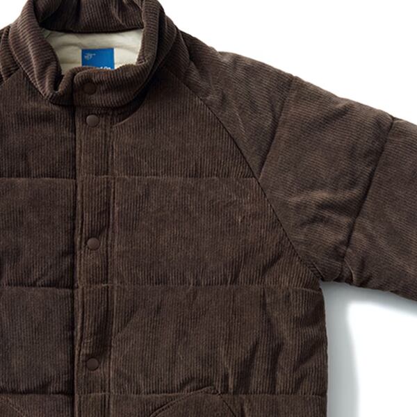 表地には風合い感のある顔料染め(Pigment dye)を施したニットコーデュロイ、裏地には発色の良い反応染めを施した柔らかく肌触りの良い4.5オンスベビージャージを使用し、ポリエステル化繊中綿に「光電子繊維」を組み合わせることにより通常の中綿に比べて軽量かつ高い保温力を実現した光電子中綿と、熱を逃がさず湿気を排出する防風用ポリウレタンフィルムをキルティング。